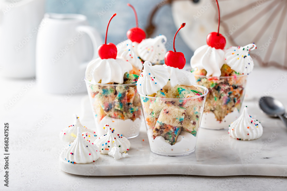 Funfetti cake trifle with meringue kisses and a cherry on top