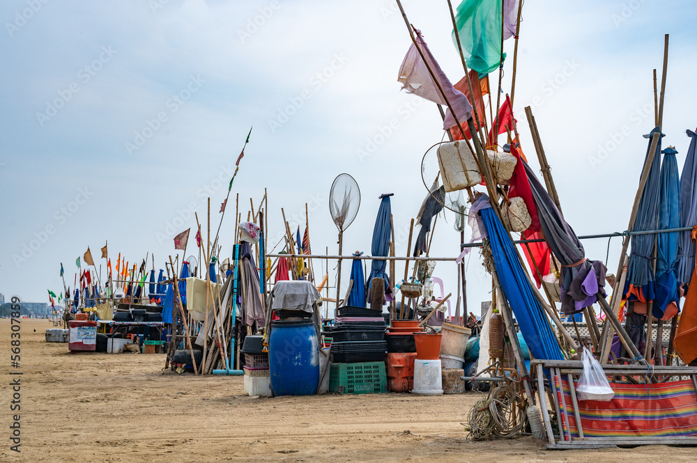 fishing accessories, tools and nets. Fishing nets collected on sand beach. big bale of fishing nets. fishing nets on the beach