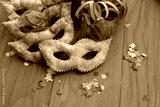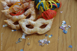 Traditional sweet crisp pastry deep-fried and sprinkled with sugar in shape of Carnival mask. Chiacchere or crostoli, bugie, cenci with confetti and paper serpentine. Copy space