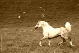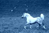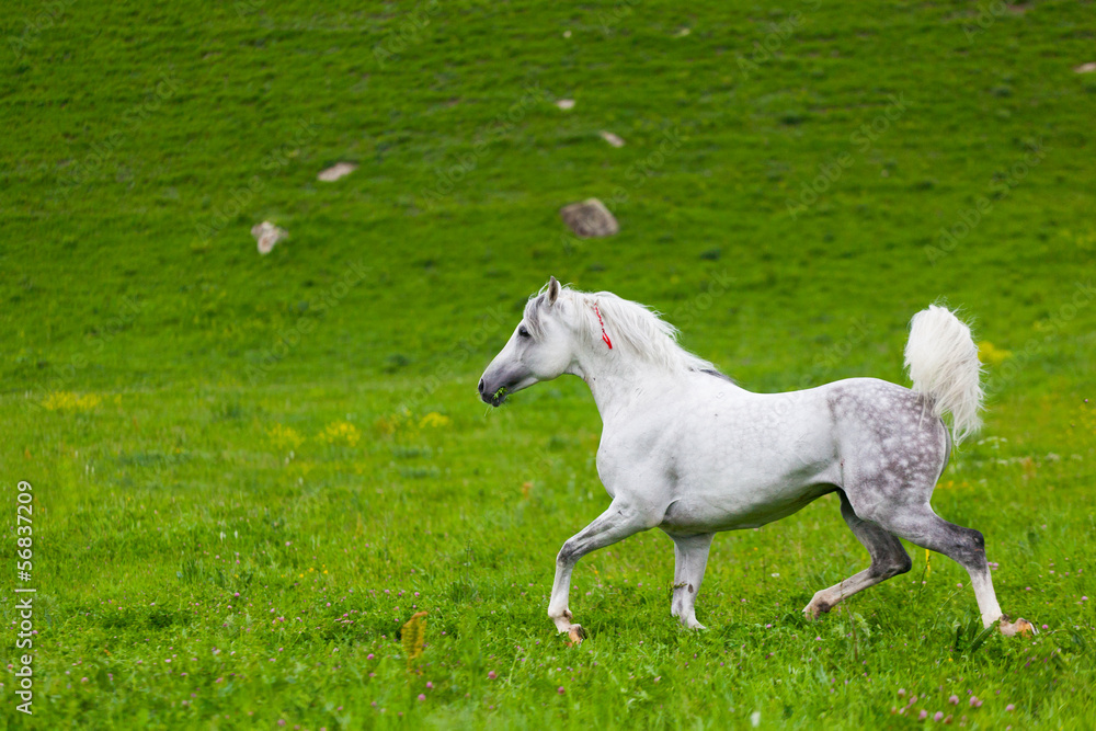 Gray Arab horse gallops on a green meadow