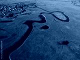 aerial view of a beautiful winding river flows among the fields, which flows picturesquely, creating incredible landscapes. between flooded fields and swamps.