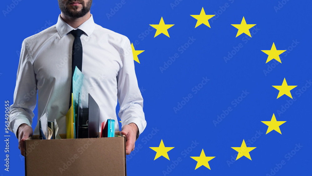 Unemployed man. European Union flag behind guy. Dismissed man With cardboard box. Unemployment in European countries. Mass layoffs in European Union. Dismissed office worker. Labor market crisis