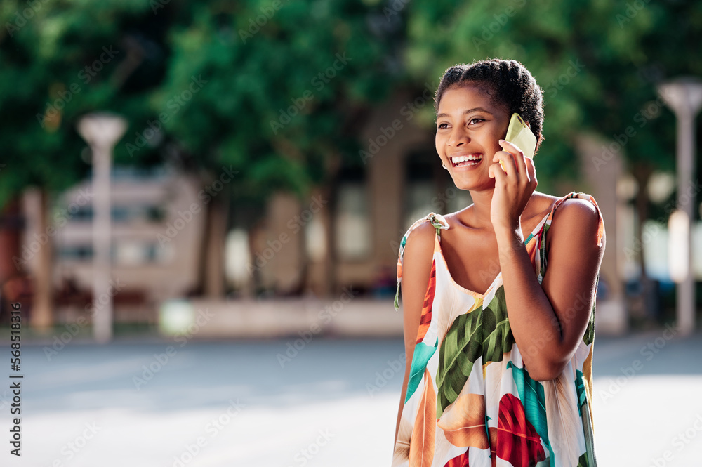 Young woman smiling while talking on the phone walking outdoors in a park.