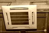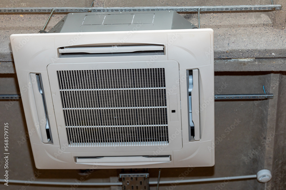 Supply and exhaust air conditioner on the ceiling of an industrial building. Cassette type air condition installation on bareskin ceiling. Microclimate system