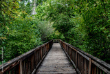 Wooden Bridge Winding Through Green Forest at Tryon Creek in Portland, OR