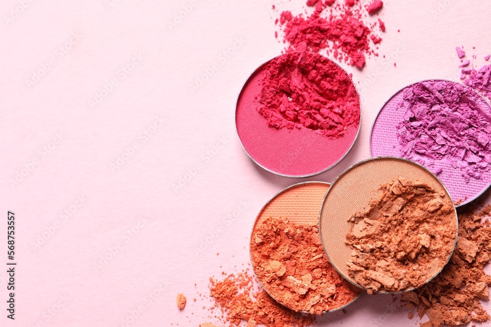 Different crushed eye shadows on pink background, flat lay. Space for text