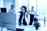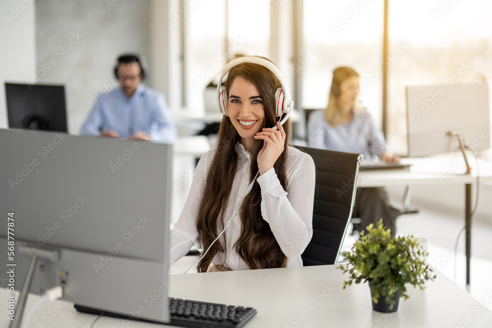 Attractive business woman agent in white shirt wearing white headset at call center