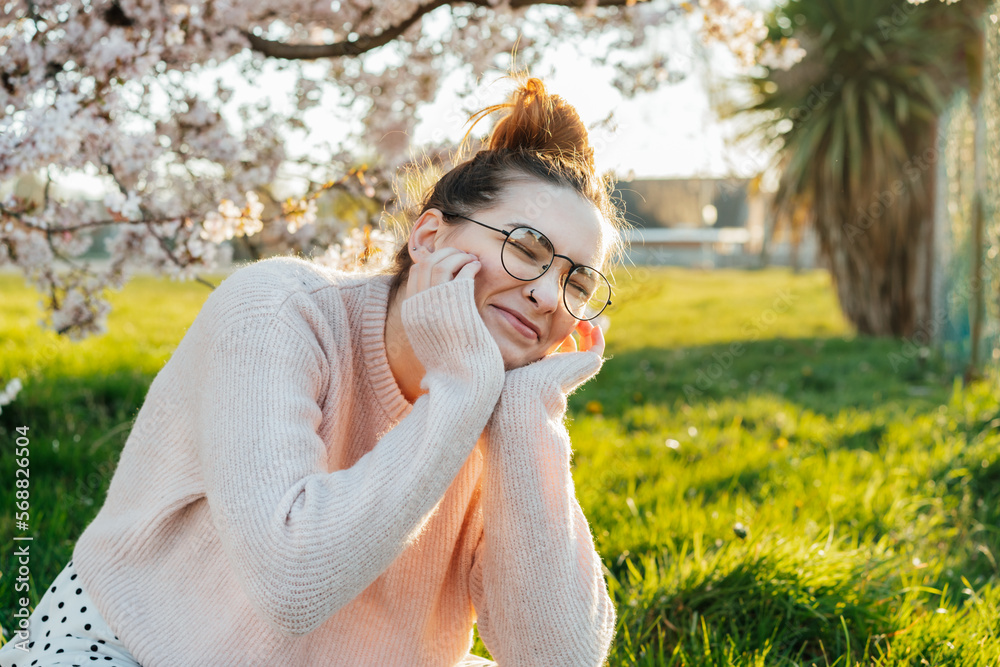 Portrait of young laughing caucasian hipster girl in glasses with pimples, acne on her face. Body positivity and diversity. Teenage skincare problems. Generation Z girl enjoy spring mood.