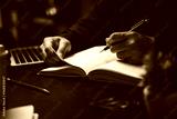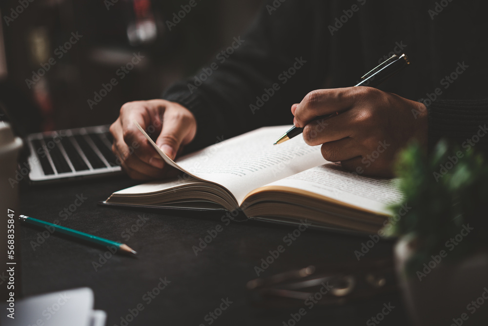 Businessperson reading and writing on book.education studying knowledge development and cognition learning concept.