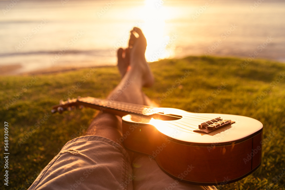 Young man relaxing siting by the beach at sunset with guitar