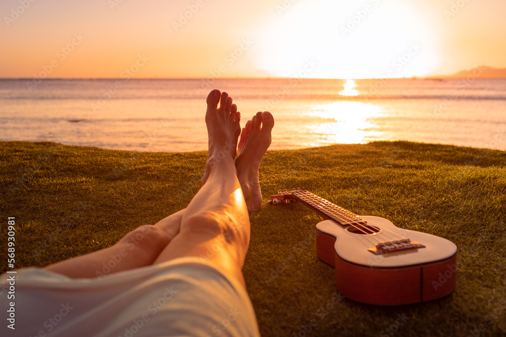 Happy summer days. Person relaxing feet by the sea enjoying sunset on a beach vacation