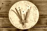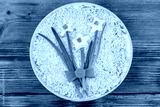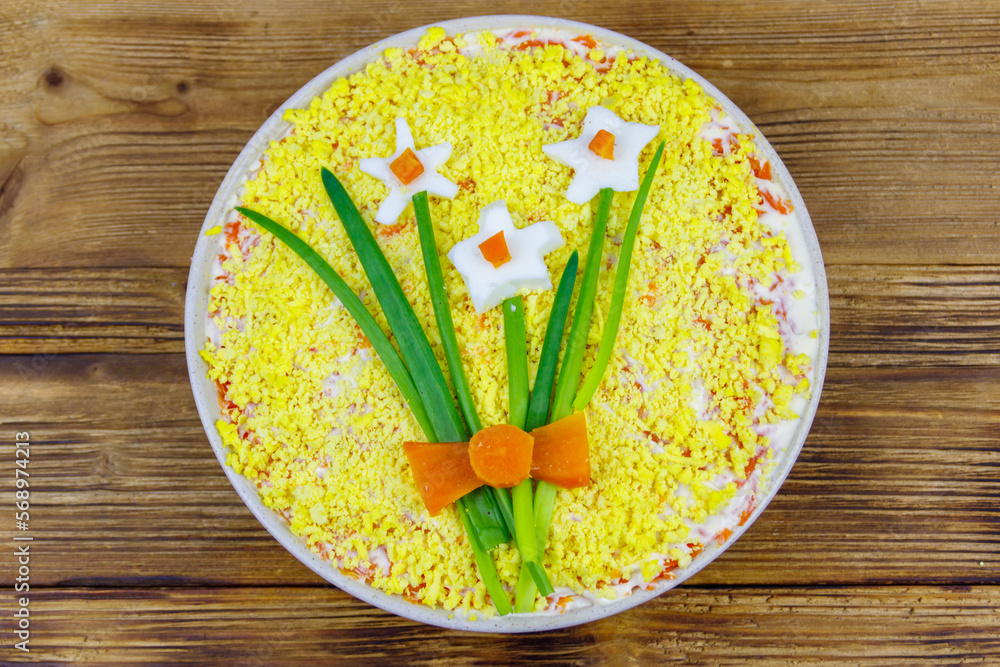 Traditional russian layered salad Mimosa with spring decoration Daffodil on wooden table. Top view. Decoration is made of egg, green onion and carrot