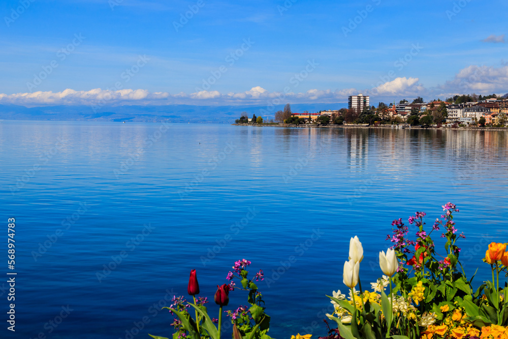 Beautiful view with colourful spring flowers on the Alps Mountains and Lake Geneva in Montreux, Switzerland