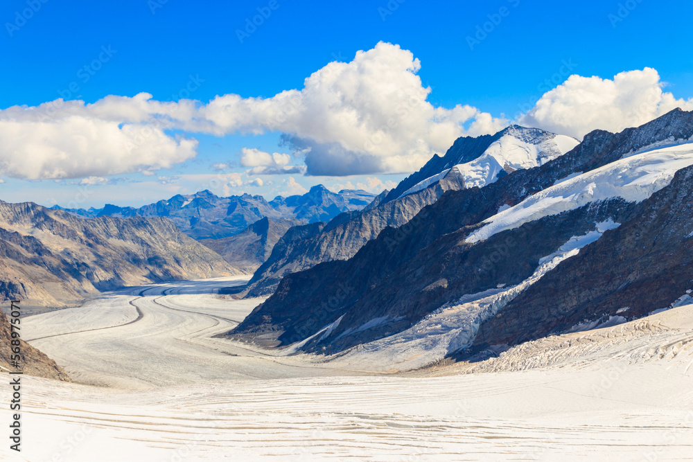 View of Great Aletsch Glacier, the largest glacier in the Alps and UNESCO heritage, in Canton of Valais, Switzerland