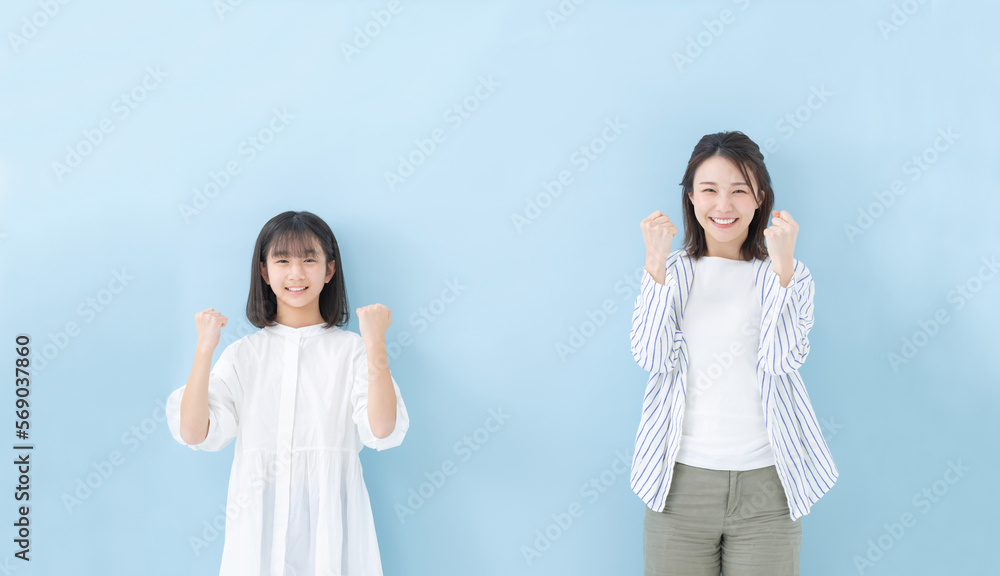 ガッツポーズ・親子・家族・2人・ブルーバック