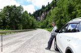 A grown man stopped by the road, stood near a car in the forest of the mountains, looks into the camera, day