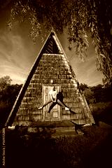 Young funny man jumping at the countryside by the rustic old building and pond. Guy wearing casual clothes taking a great leap. Summer travel holidays, fun and freedom concepts.