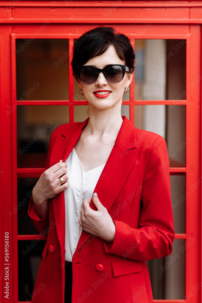 Smiling confident young brunette European woman with make up wears trendy sunglasses and fashionable red jacket poses against street red phone booth. Elegant girl spends free time in city.