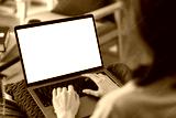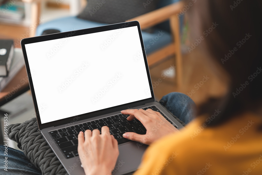 Woman hand type a message on the keyboard on laptop with blank copy space screen, mock-up for the application.