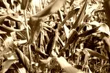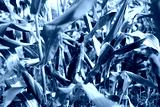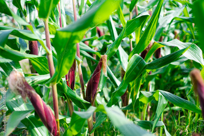 Selective focus purple corn cobs with silks on long stalk ready to harvest at organic farm in North Vietnam, Southeast Asia
