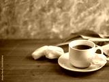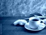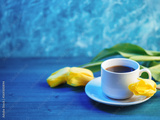 cup of espresso coffee on a wooden blue table and yellow tulips. springtime copy space