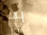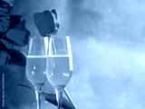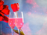 A bouquet of spring tulips and two glasses of pink champagne on a blue background . International Women's Day, copy space