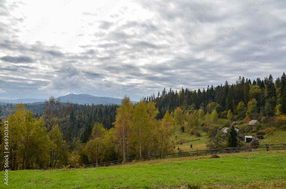 Beautiful morning cloudy autumn day is in mountain landscape. Carpathians, Travel at Ukraine. Beauty of nature concept