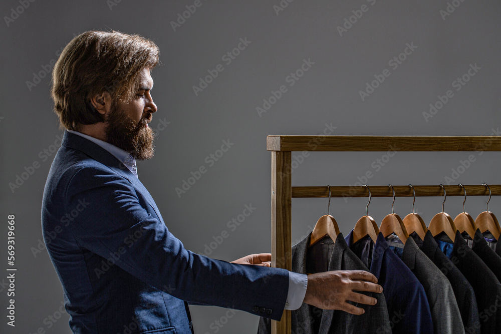 Male suits hanging in a row. Men clothing, boutiques. Tailor, tailoring. Stylish men's suit. Man suit, tailor in his workshop. Handsome bearded fashion man in classical costume suit