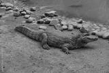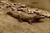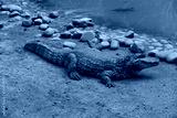 Brazilian alligator with its reflection in pond trying to escape the heat