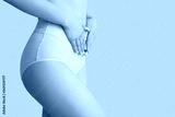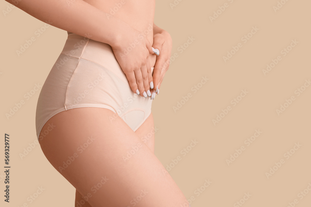 Young woman in menstrual panties on beige background, closeup