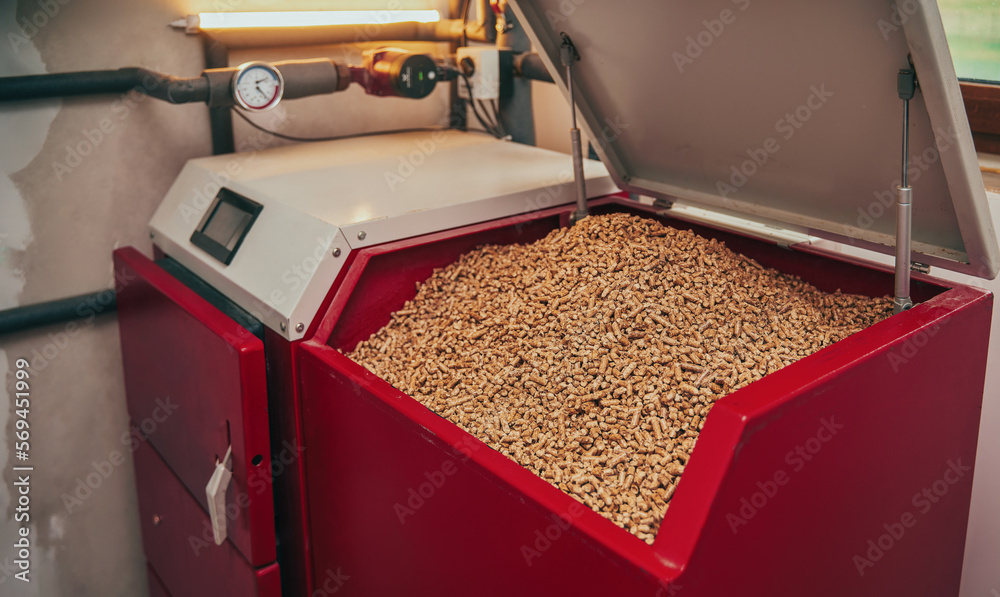 Wood pellets heating stove. Boiler room in private household working on alternative energy biofuel. Sustainable Future Concept