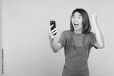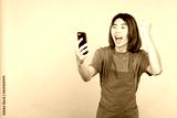 Asian gardener celebrating while looking at the mobile