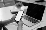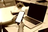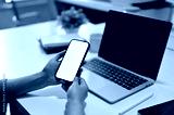 Close-up image of a female offie worker using her smartphone at her office desk.