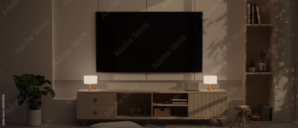 Contemporary and comfortable living room at night interior design with large TV screen on the wall
