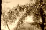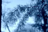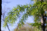 A branch of larch with young needles against the blue sky in the forest. spring theme.
