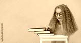 School education and literacy concept with cute little girl in glasses with curly hair bored with books stack isolated on background. Back to school. International children book day. Children's Day