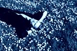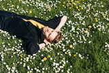 Spring allergies. A Young man sneezing amidst a blooming flowers, symbolizing spring allergies. Young male laying in green grass. Spring fatigue sleep and calm nap in allergy season.