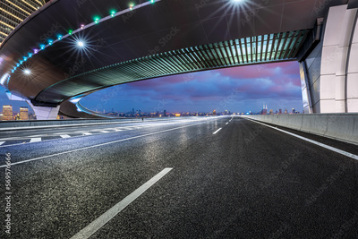 Asphalt road and bridge with city skyline at night in Shanghai, China.