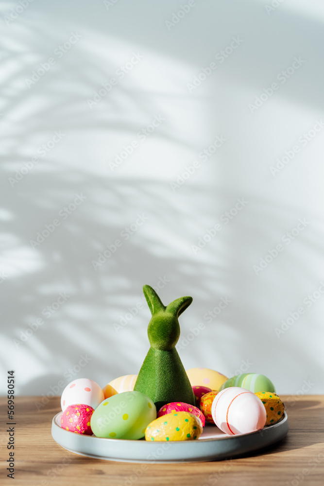 Easter home decor. Composition of Green bunny rabbit figurine and colored easter chocolate eggs on the plate on the wooden console with sunlight and shadows on white wall. Vertical. Selective focus.