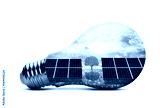 Eco LED light bulb with solar energy panels isolated on transparent background, PNG. Concept of green energy.