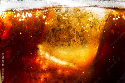 macro cola drink background,Close up view of ice cubes in dark cola background. Surface of sweet summer cold drink with foam and macro bubbles on glass wall. Fizzing or float to the top of the surface