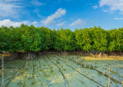 Mangrove forest,River along the mangrove trees,Mangrove forests play a vital role in tropical areas worldwide. They act as nurseries for many marine species