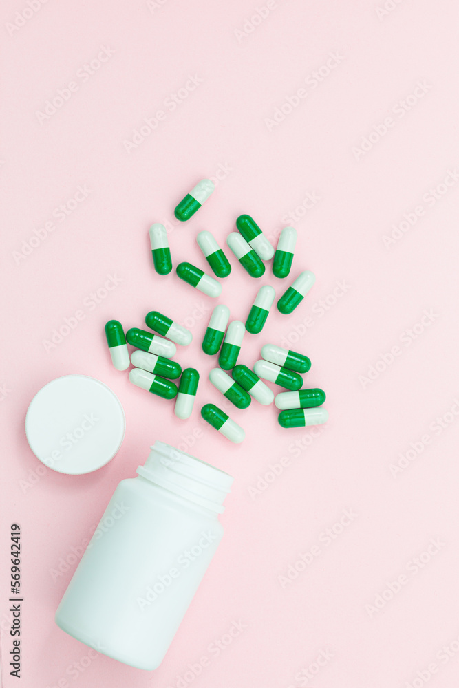 pills and white pills on pink background,Assorted pharmaceutical medicine pills, tablets and capsules and bottle on pink background. Top view. Flat lay. Copy space. Medicine concept.