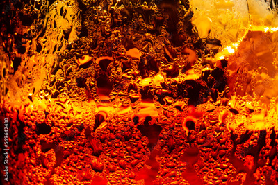 macro cola drink background,Close up view of ice cubes in dark cola background. Surface of sweet summer cold drink with foam and macro bubbles on glass wall. Fizzing or float to the top of the surface
