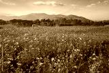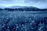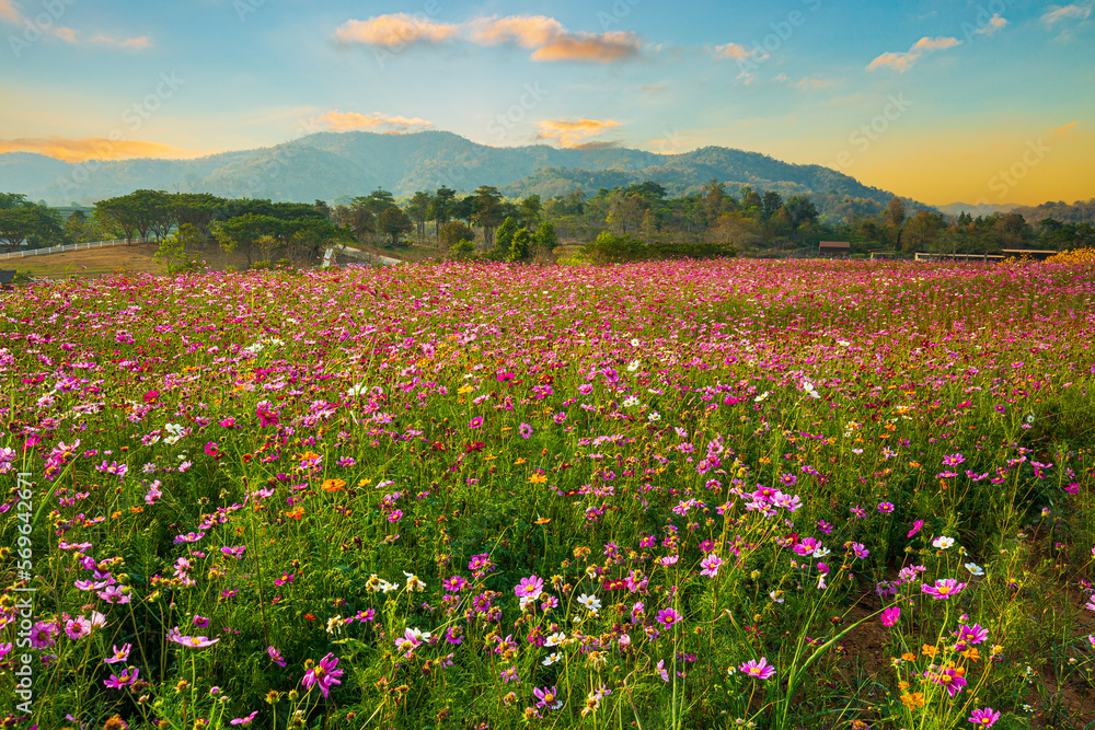 Beautiful flower fields and mountains,View of beautiful cosmos flower field in sunset time.
