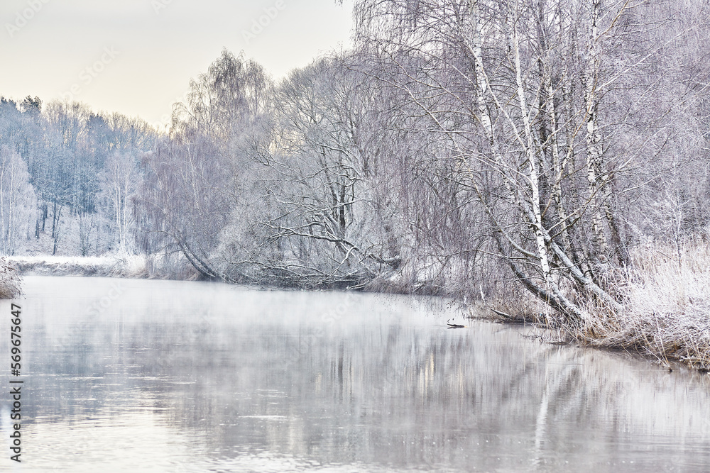 Snow on winter nature park. Cold Weather forest landscape, trees reflection in water. Frost on grass, cane. January fog. Forest river sunrise. Europe rural scene