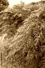 Two Heavenly bamboo bushes with frost on early winter morning Nandina domestica bush on a sunny day in the garden