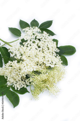 Cut Elderberry branch with white flowers, blossoms and green leaves isolated on white background. Sambucus nigra in bloom