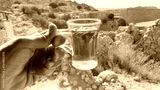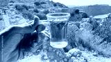 Clear glass cup of delicious sweet mint tea overlooking Arabian desert mountainous landscape in Jordan, Middle East