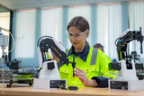 Engineer factory industry control automation welding robot arms machine is intelligent industrial system with automate technology system for factory industry manufacture concept.